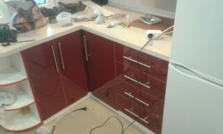 | Замена старых дверок из ЛДСП на акриловый МДФ + замена ручек. Замена старых навесов на новые с доводчиком |